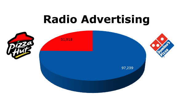 On Radio, Domino's takes the lead with 97,239 ads and Pizza Hut came in with 31,918 spots in the last 12 months. Domino's big Superbowl month was February with 24,794 ads, while Pizza Hut was warm in November with 6,281 spots.