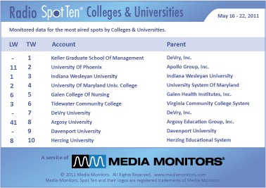 The winner in the higher education radio ad-a-thon last week was KELLER GRADUATE SCHOOL OF MANAGEMENT with 7,666 spots. The UNIVERSITY OF PHOENIX rose from #11 to #2 with 7,427 spots, while IDIANA WESELYAN UNIVERSITY aired 822 spots to come in #3. UNIVERSITY OF MARYLAND was #4 with 794 spots and GALEN COLLEGE OF NURSING held down #5 with 494 commercials. TIDEWATER COMMUNITY COLLEGE was #6 with 432 ads, while DEVRY UNIVERSITY was #7 with 415 spots. ARGOSY UNIVERSITY leaped from #41 to #8 with 411 spots and DAVENPORT UNIVERSITY was #9 airing 399 spots. Coming in #10 was HERZING UNIVERSITY with 316 spots.