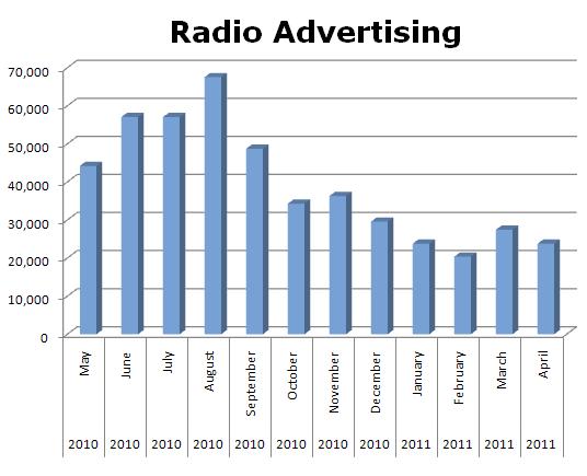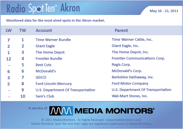 The #1 Radio advertiser in Akron last week was the TIME WARNER BUNDLE with 315 spots. GIANT EAGLE (Grocery) was 32 with 278 spots, while THE HOME DEPOT was #3 airing 274 commercials. FRONTIER BUNDLE was #4, up from #12, with 252 spots and BEST CUTS was #5 with 184 ads. MCDONALD’S was #6 with 158 spots, while GEICO was #7 running 155 spots. FORD LINCOLN MERCURY was #8 with 150 spots and the US DEPARTMENT OF TRANSPORTATION cruised into #9 with 149 announcements. SAM’S CLUB was #10 with 146 spots.