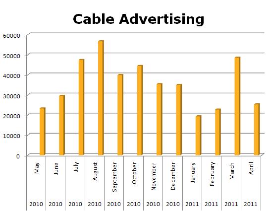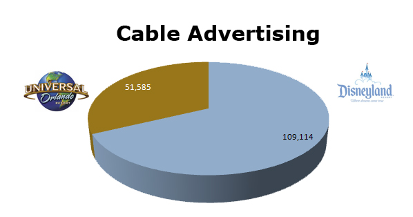 On Cable, Universal ran 51,585 spots against Disney’s 109,114 spots. The biggest months out of the last 12 for Universal were this April at 9,776 and May of 2010 at 8,044 spots.