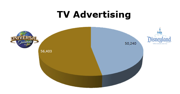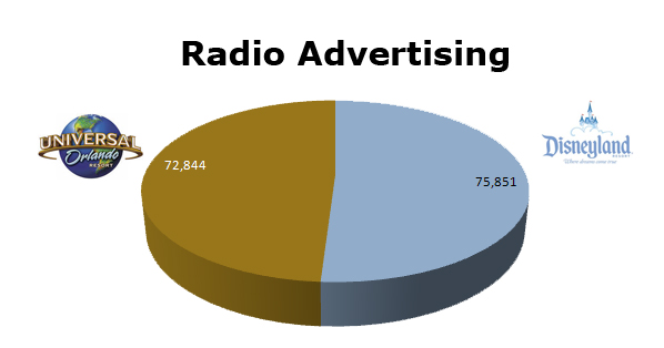 On Radio, both resorts were neck and neck with Universal clearing 72,844 spots and Disney ran 75,851 ads. Disney ran heavy this March with 11,553, while Universal was hottest in February with 10,196 spots.