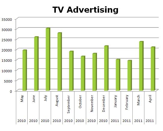 On TV, the group ran 253,927 spots with spikes last July at 30,268 ads and a slight rebound last March with 23,774 spots.