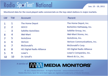 Still the one, THE HOME DEPOT ran 50,731 spots to dominate National radio in the USA. GEICO again was at #2 with 37,632 spots, while SAFELITE AUTOGLASS rose to #3 with 37,068 ads. WALMART came in #4 with 34,163 spots and AUTOZONE arrived at #5 with 31,470 spots.