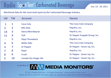 On top of the game is coca-cola with 5,175 spots. MOUNTAIN DEW was #2 running 2,167 ads, while SIERRA MIST NATURAL stopped at #3 airing 2,102 spots. 7UP slid into #4 with 1,971 spots and PEPSI THROWBACK was #5 with 1,691 spots. MELLO YELLO came in at #6 with 1,686 ads and DR. PEPPER stayed at #7 last week with 1,542 spots. PEPSI was #8 with 1,001 spots, while CRUSH rolled into #9 from #14 with 893 spots. Coming in #10 was CANADA DRY GINGER ALE with 586 spots.