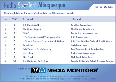 In Albuquerque last week the #1 radio advertiser was THE SAFELITE AUTOGLASS with 815 spots. THE HOME DEPOT was #2 running 761 ads, while GEICO slid into #3 airing 709 announcements. The U.S. DEPARTMENT OF TRANSPORTATION bagged #4 with 638 spots and U.S. NEW MEXICO FEDERAL CREDIT UNION claimed #5 with 637 commercials. The AUTOZONE was #6 with 533 spots, while BOB TURNER'S FORD COUNTRY held down #7 with 519 spots. The NUTRISHOP was #8 with 488 spots and RICH FORD was #9 with 459 spots. SANDIA RESORT & CASINO put it all on #10 with 296 spots.