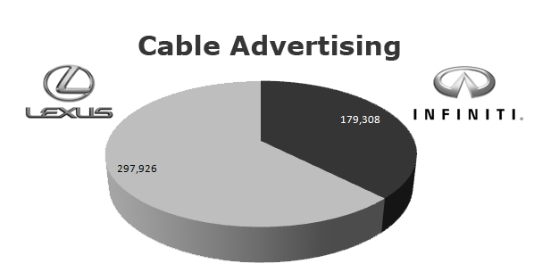On TV, Lexus again excels with 130,015 spots to Infiniti’s 44,129 ads. On TV, Infiniti aired about 33.9% of the ads that Lexus ran on that media in the last 12 months.