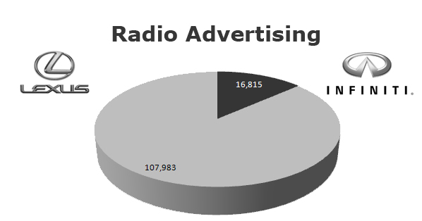 On the Radio, Lexus really clobbers Infiniti. Lexus ran 107,983 spots in the last 12 months, while Infiniti ran only 16,815 radio ads. The hottest month for Lexus was September with 27,362 spots.