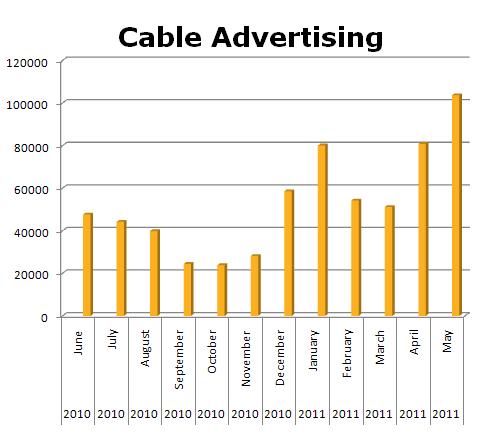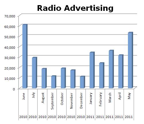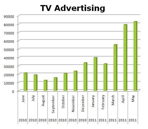 In TV, it appears that they are on a steady upward movement in this media. The total for the last 12 months was 434,977 with the last two months pouring it on: April (79,252) and May (82,836).