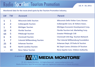 In this category the #1 radio advertiser in the USA was WISCONSIN DELLS TOURISM, the big cheese with 825 spots. INDIANAPOLIS TOURISM kept pace at #2 with 469 spots, while MICHIGAN TOURISM drove into #3 with 432 spots. FLORIDA TOURISM coasted into #4 with 317 ads and PITTSBURGH rambled from #64 to #5 with 306 spots. CINCINNATI was the queen at #6 with 299 commercials, while COLONIAL WILLIAMSBURG TOURISM was quite historic at #7 with 255 ads. ARKANSAS TOURISM was razor-sharp at #8 airing 238 announcements and NORTH CAROLINA TOURISM on your mind at #9 with 234 spots. RENO TAHOE TOURISM rolled #10 with 223 spots.