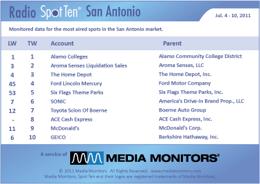 In the Alamo City the #1 radio advertiser last week was ALAMO COLLEGES with 760 spots. AROMA SENSES LIQUIDATION SALES was #2 running 601 spots, while THE HOME DEPOT was in at #3 with 484 ads. FORD LINCOLN MERCURY jumped from #45 to #4 with 482 spots and SIX FLAGS THEME PARKS went from #53 to #5 with 455 commercials. SONIC was #6 with 443 spots, while TOYOTA SCION OF BOERNE was #7 airing 388 announcements. ACE CASH EXPRESS hit #8 with 379 spots and MCDONALD’S landed in #9 with 364 spots. GEICO was #10 with 356 spots.