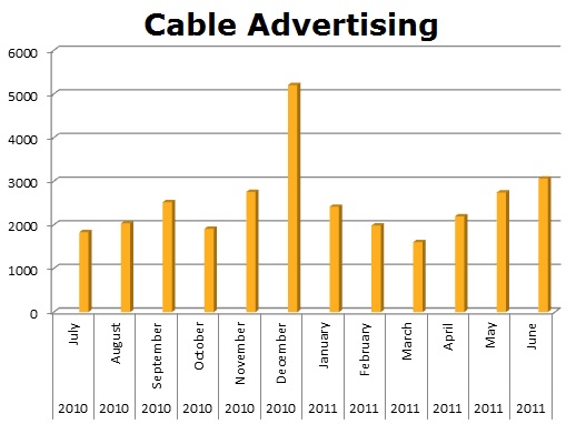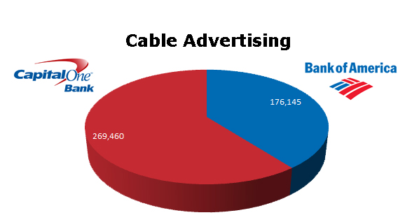 On Cable, both companies are pitching for our business with Capital One ahead of Bank of America. Capital One ran 269,460 spots against Bank of America with 176,145 ads. Bank of America’s biggest month was September with 31,781, while Capital One Bank also hit hardest in September with 31,836 spots.