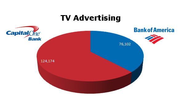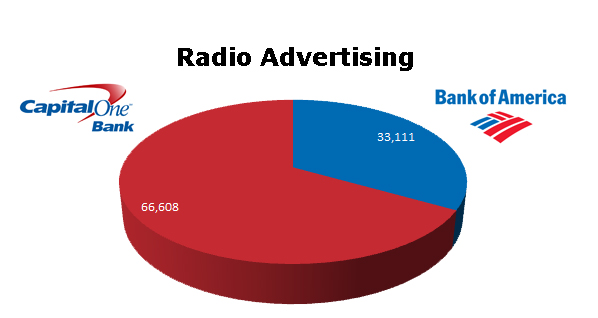 On the Radio, Capital One ran 66,608 spots, while Bank of America ran 33,111 spots in the last 12 months. Bank of America ran the most spots in May of this year with 8,784 and Capital One played hardball in November with 11,329 ads.