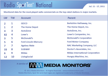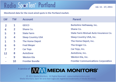 Last week in Portland, the #1 advertiser on the radio was GEICO with 721 spots. The SHANE COMPANY twinkled at #2 with 614 ads, while STATE FARM was #3 with 574 commercials. SLEEP COUNTRY USA was #4 with 495 spot and THE HOME DEPOT dropped from #1 to #5 with 488 spots. FRED MEYER landed in #6 with 443 spots, while CAR TOYS stayed at #7 with 440 spots. AUTOZONE was #8 airing 428 announcements and WESTON KIA was #9 with 421 spots. FRONTIER BUNDLE was #10 with 421 spots as well.