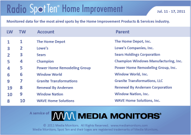 The #1 advertiser in Home Improvement was THE HOME DEPOT of course, with 36,884 spots. Coming in #2 was LOWE’S with 29,094 ads, while SEARS was #3 with 2,005 ads. CHAMPION was #4 with 1,318 spots and POWER HOME IMPROVEMENT GROUP was #5 running 1,013 spots. WINDOW WORLD closed on #6 with 748 commercials, while GRANITE TRANSFORMATIONS held at #7 with 392 spots. RENEWAL BY ANDERSEN took #8 with 358 spots and WINDOW NATION came in #9 with 357 ads. WAVE HOME SOLUTIONS was #10 with 354 spots