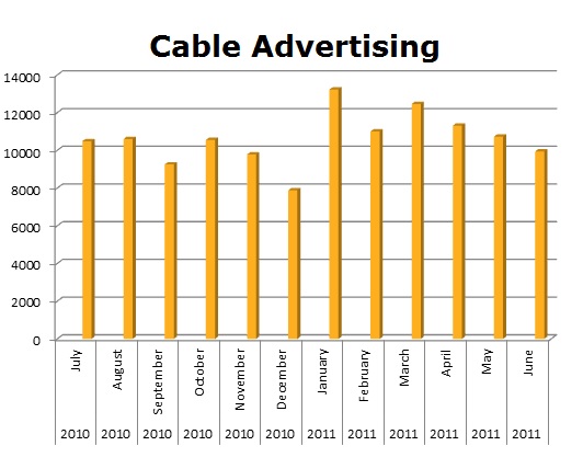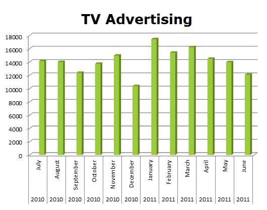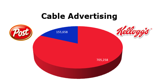 In the last 12 months, Post ran 155,658 commercials on Local Cable. Kellogg’s ran more than three times the spots at 705,258. Post’s biggest month was last month, June with 25,984 spots against Kellogg’s biggest month last July 2010 with 94,521 ads.