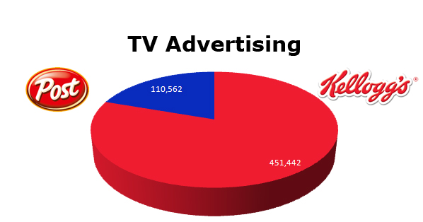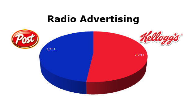 On TV, Kellogg’s is king again with 451,442 spots in the last 12 months compared to Post’s 110,562 spots. Kellogg’s biggest month was last September with 56,353 spots and Post’s most productive month was March 2011 with 14,667 spots.