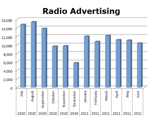 On Radio, both Cereal advertisers filled small bowls. Post ran only 7,251 spots in the last 12 months, while Kellogg’s ran 7,793 ads. But Kellogg’s ran more than 2,000 spots a month in April, May and June. Let’s see if that continues.