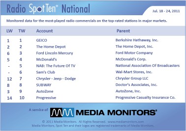 On the national front, GEICO stayed #1 with 46,285 spots. THE HOME DEPOT maintained #2 with 44,057 commercials, while FORD LINCOLN MERCURY makes its moves from #6 up to #3 with 27,975 ads. MCDONALD’S was #4 with 27,467 spots and breaking into the top five this week was NAB: THE FUTURE OF TV campaign with 22,672 spots. Of note, CHRYSLER JEEP DODGE jumped from #12 to #7 with 17,003 spots; two American car companies in the top ten.