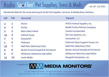 This time of the year must be a slow time for Pet Supplies Services and Medical with the #1 company is this category PETCO with 203 spots. PURINA was #2 with 195 spots, while MAN’S BEST FRIEND was #3 running 149 spots. SWHEAT SCOOP was #4 in the nation with 95 spots and HOMEOPET was #5 airing 90 announcements. PETSMART was #6 with 84 spots, while WELL PETS VETERINARY CLINIC was #7 with 82 spots. BECKER ANIMAL HOSPITAL & PET RESORT was #8 with 78 spots and OKLAHOMA VETERINARY SPECIALISTS was #9 with 74 spots. Coming in #10 was UNCLE MATTY with 66 spots.
