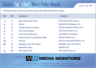 The #1 advertiser on the radio in West Palm Beach last week was WEST PALM BEACH KIA with 1,126 spots. GEICO was #2 with 812 ads, while FLORIDA’S BLOOD CENTERS were #3 with 571 commercials. THE HOME DEPOT was#4 running 563 spots and FORD LINCOLN MERCURY drove into #5 with 423 spots. AROMA SENSES LIQUIDATION SALES was #6 airing 378 announcements, while VERIZON checked in at #7 with 339 spots. STEINER, ISCOE & GREENE jumped from #49 to #8 with 333 spots and MERCEDES-BENZ was #9 with 332 spots. And coming in #10 was OFF LEASE ONLY with 314 spots.