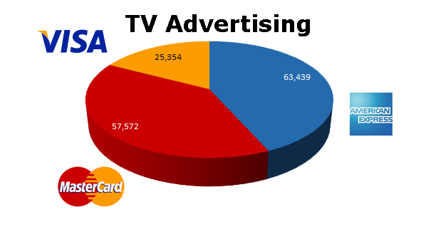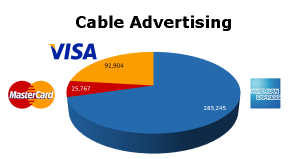 On TV, American Express ran 63,439 spots in the last 12 months and MasterCard gets in the game with 57,572 spots. Visa ran 25,354 spots. Amex ran hottest in December with 8,423 spots and MasterCard ran hot in June 2011 with 8,017 spots. Visa ran the most spots in the last 12 months in January with 4,568 ads.