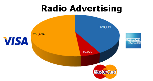 On the Radio, Visa bests the other two credit people. Visa ran 256,694 spots in the last 12 months. American Express was right on their tail with 209,215 spots. And MasterCard was short with 30,929. August 2010 was Amex’s biggest month with 38,802 spots, while Visa ran hottest also last August with 65,903 ads. MasterCard ran the most spots in September with 4,633 spots.