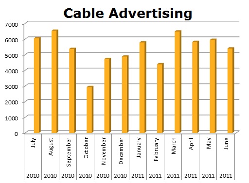On Local Cable, American Express is the kingpin with 283,245 spots in the last 12 months. Visa was second with 92,904 spots and MasterCard came up the rear with 25,767 spots. There is nothing like a credit card at Christmas time, and Amex poured it on last December with 51,036 spots. MasterCard’s biggest month was November with 4,525 spots, while Visa cranked it up in last May with 15,127 spots.