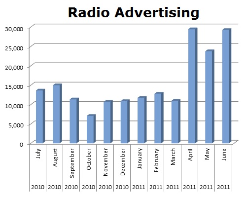 On Radio, Carmax ran the most spots out of the three media. In the last 12 months they ran 186,473 spots. Their two biggest months were April 2011 with 29,437 spots and last month, June with 29,247 ads.