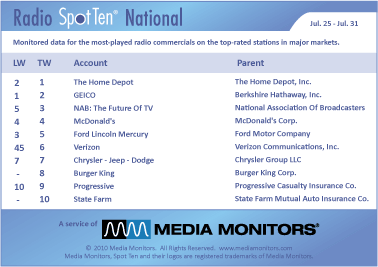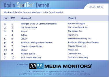 In the Motor City last week the #1 radio advertiser was the MICHIGHAN DEPT. OF COMMUNITY HEALTH with 1,292 spots. THE HOME DEPOT was #2 with 865 spots, while KROGER took #3 with 576 ads. BORICS was #4 airing 540 announcements and GEICO rolled into #5 with 503 spots. SOUTHEAST MICHIGHAN FORD DEALERS ran 496 spots to land in #6, while CHRYSLER JEEP DODGE was #7 with 496 spots. MEIJER leaped from #25 to #8 running 455 spots and XFINITY BUNDLE connected at #9 with 452 spots. And coming in #10 FORD LINCOLN MERCURY was #10 with 443 spots.