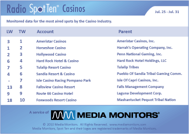 Lots of people gambling these days and the national numbers on Casino time-buys are in. #1 was AMERISTAR CASINOS going all in with 1,189 spots. HORSESHOE CASINO galloped into #2 with 858 spots and HOLLYWOOD CASINO glittered at #3 airing 691 announcements. HARD ROCK HOTEL & CASINO rolled into #4 with 667 spots, while TULALIP RESORT CASINO landed on #5 with 552 spots. SANDIA RESORT & CASINO drew #7 and dealt 523 spots to take lucky #7. ISLE CASINO RACING POMPANO PARK trotted into #7 with 444 spots and FALLSVIEW CASINO RESORT held #8 with 438 spots. ROUTE 66 CASINO HOTEL was a solid #9 with 436 spots and FOXWOODS RESORT CASINO took reservations at #10 running 931 spots.