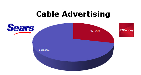On Cable, Sears ran 658,661 spots against JCPenney’s 263,204 ads, which was only 40% as many spots as Sears. Sears ran hottest in December with 86,753 spots, while JCPenney ran hot in November with 44,582 and then 42,345 in December.