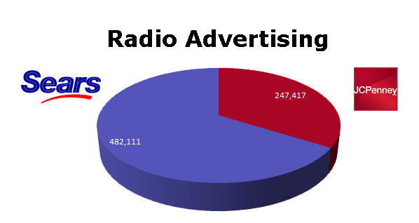 On the Radio, Sears ran 482,111 ads against JCPenney’s 247,417 spots. JCPenney bought the most in December with 53,866 spots, while Sears ran the most this last May with 50,796 spots.