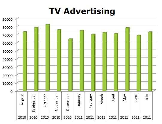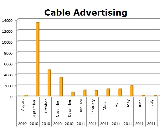 On Local Cable, CBS-TV did not invest a lot. They ran only 29,510 for the last 12 months. The biggest month was the start of the new season in September 2010 with 13,452 spots.