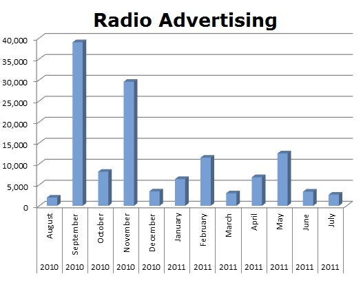 CBS owns Radio station, so of course it is part of their marketing plan. In the last 12 months they ran 128,322 spots on radio with big months in September 2010 with 38,988 spots followed by November with 29,590 ads.