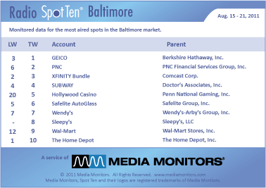 In Baltimore last week, GEICO was the #1 radio advertiser with 775 spots. Coming in #2 was PNC with 633 spots, while XFINITY BUNDLE wrapped up #3 running 595 commercials. SUBWAY was #4 airing 402 announcements and HOLLYWOOD CASINO scored #5 with 392 ads. SAFELITE AUTOGLASS was #6 with 386 spots, while WENDY’S was #7 with 371 spots. SLEEPY’S rested at #8 running 349 spots and WAL-MART took #9 with 333 spots and dropping from #1 to #10 was THE HOME DEPOT with 323 spots.