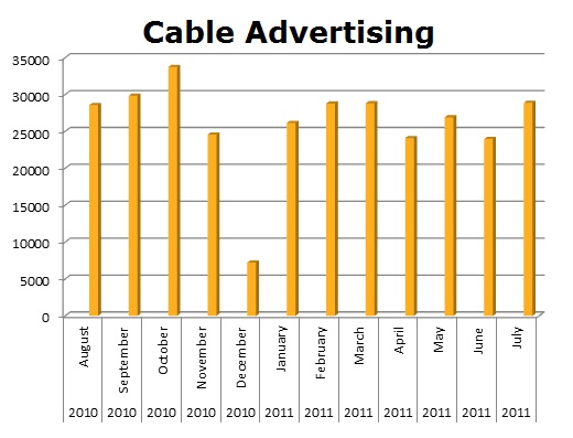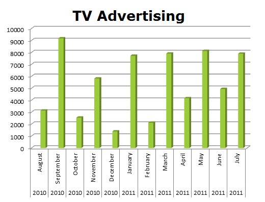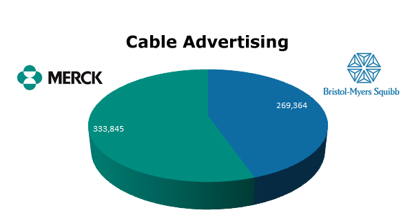 On Cable, Merck is slightly ahead of Bristol-Myers Squibb. Merck ran 333,845 ads in the last 12 months against B-M S’s 269,364 spots. Bristol-Myers Squibb’s biggest month was August 2010 with 36,093 spots, while Merck’s biggest month was May 2011 when they ran 49,440 spots.