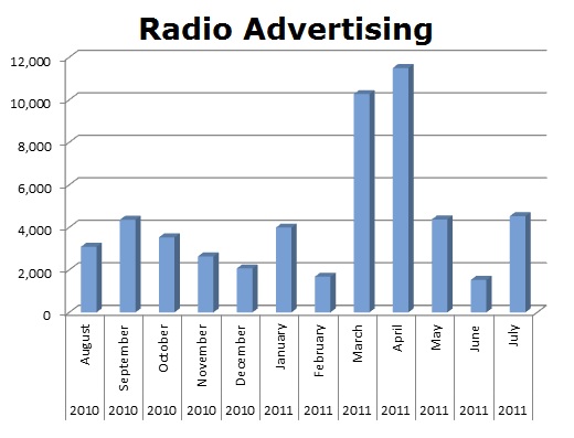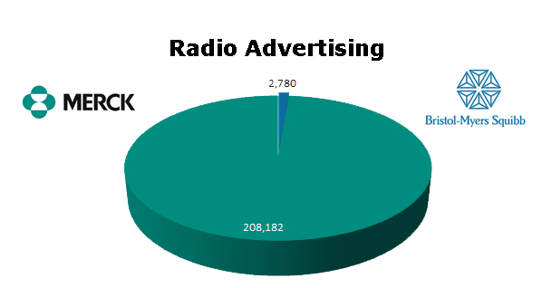 On the Radio, Bristol-Myers Squibb was almost a no-show with 2,780 spots in the last 12 months, while Merck ran 208,182 spots. Merck started out the year 2011 by running 44,571 spots in January.