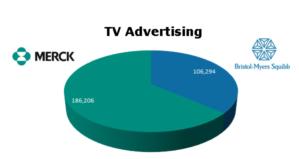 On TV, Bristol-Myers Squibb aired 57.1% as many spots as Merck. Merck ran 186,206 spots against Bristol-Myers Squibb cleared 106,294 spots in the last 12 months. Merck’s biggest month was August 2010 when they ran 26,226 spots, while Bristol-Myers Squibb ran hottest this past April with 10,283 spots.