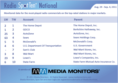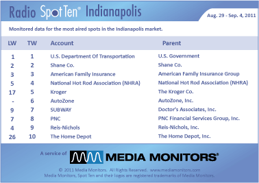 In Indianapolis last week, the number one radio advertiser was the US DEPARTMENT OF TRANSPORTATION with 787 spots. The SHANE COMPANY sparkled at #2 with 636 ads, while AMERICAN FAMILY INSURANCE claimed #3 with 617 spots. Racing into #4 was the NATIONAL HOT ROD ASSOCIATION (NHRA) running 588 spots and KROGER jumped from #17 to #5 with 484 commercials. AUTOZONE owned #6 with 467 spots, while SUBWAY wrapped up #7 with 467 ads. PNC cleared 464 spots making them #8 and REIS-NICHOLS clocked 423 spots to land in #9. THE HOME DEPOT moved from #26 to #10 airing 374 announcements.
