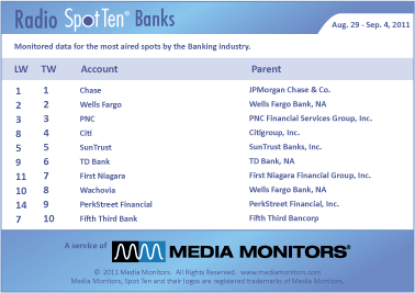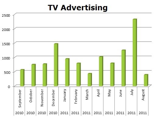 The king of the hill of money in the Bank category was CHASE with 18,404 spots. WELLS FARGO was a solid #2 with 9,396 ads. PNC was #3 airing 5,726 commercials, while CITI jumped #8 to #4 with 2,519 spots. SUNTRUST was #5 with 2,310 spots and TD BANK was #6 with 2,008 ads. FIRST NIAGARA was #7 with 1,428, while some the “still” WACHOVIA markets ran 1,428 spots to keep them at #8. PERKSTREET FINANCIAL was #9 with 1,185 spots and Cincinnati’s FIFTH THIRD BANK was #10 running 1,067 spots.