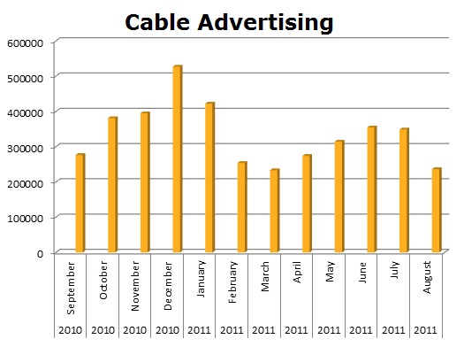 It would make sense that one of the pioneers in Cable programming would use Cable to promote themselves. In the last 12 months, Turner has run 4,016,530 spots selling their many offerings. As a matter of fact, that is 98.2% of all the ads they ran on Cable, Radio and TV. December was the biggest month with 526,819 spots.