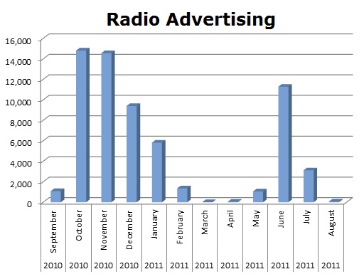 Many of the Turner shows do not run in the traditional network TV schedules, thus the different approach to marketing. They ran 62,617 spots on the Radio in the last 12 months, but focused on October (14,814) and November (14,562) for their major impressions.