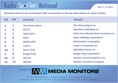The flip-flop continues with THE HOME DEPOT taking back #1 airing 49,052 spots last week against GEICO’s 43,985 that landed them in #2. STATE FARM is making a strong move with 31,852 keeping them in #3. SEARS on the move as well, jumping from #9 to #4 airing 31,530 spots, while MCDONALD’S had a slight dip to #5 with 25,768 spots.