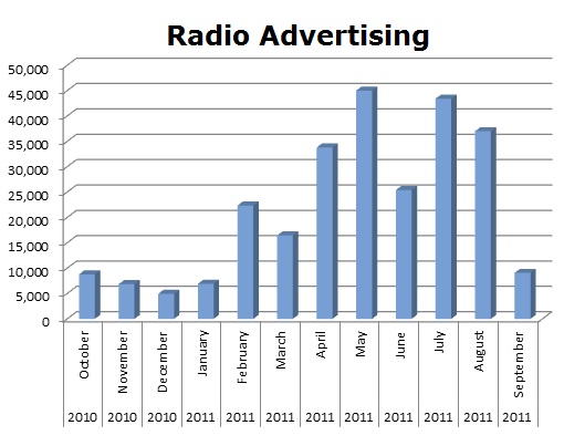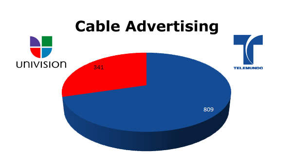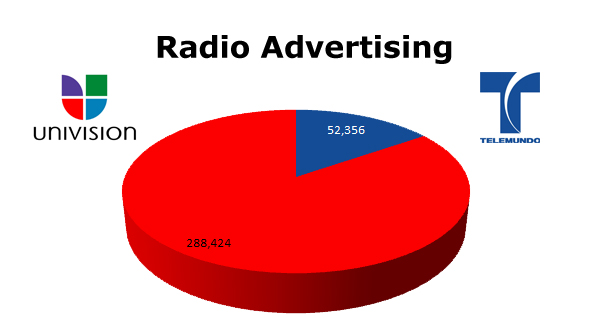 On the Radio, Univision is the stronger advertiser with 288,424 spots in the last 12 months, while Telemundo ran 52,356 spots. The biggest month for Univision was the new season in October 2010 with 27,507 spots and Telemundo’s hottest month was last May with 9,383 spots.