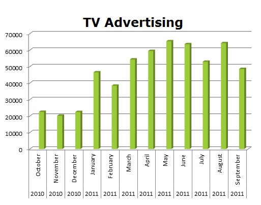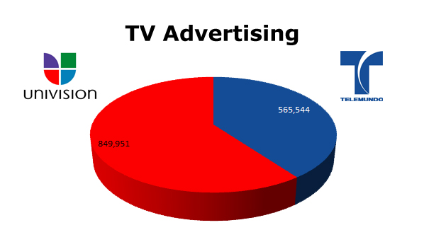 On TV, Univision is the clear winner with 849,951 spots in the last 12 months, while Telemundo ran 565,544 ads. Univision’s hottest month was January 2010 with 80,241 spots and Telemundo’s biggest month was May of this year with 55,025 spots.