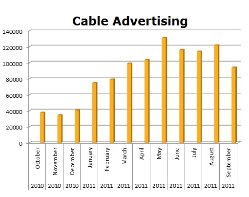 On Local Cable these two giants really don’t spend that much. Telemundo ran only 809 spots in 12 months, while Univision only cleared 341 spots. If you think about it, all their advertising is in Spanish and would not run on Anglo cable channels. Telemundo’s biggest month on cable was April with 560 spots, while Univision ran the most spots last October at 226 units.