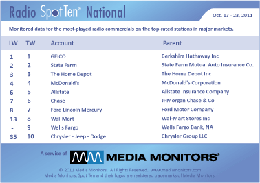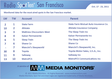 The #1 radio advertiser in the city by the bay last week was STATE FARM with 889 spots. #2 was ALLSTATE, jumping up from #10, with 763 spots, while MATTRESS DISCOUNTERS WEST rested at #3 with 739 commercials. KAISER PERMANENTE locked up #4 airing 702 announcements and SLEEP TRAIN tucked-in at #5 with 699 spots. SHANE COMPANY shined at #6 running 674 spots, while MANCINI’S SLEEPWORLD took #7 with 624 spots. TOYOTA soared from #30 to #8 with 599 spots and SAFEWAY slid into #9 with 598 spots. And coming in #10 was METROPCS running 581 spots.