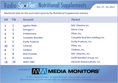 Everyone seems to be taking a supplement these days and radio has the spots. Last week in this category the #1 advertiser was AGELESS MALE with 10,197 spots. EMERGEN-C was #2 with 3,618 commercials, while PRONUTRITION powered into #3 airing 3,256 spots. COMPLETE NUTRITION was #4 with 2,214 spots and PURITY PRODUCTS was #5 with 1,408 ads. CENTRUM catapulted from #42 to #6 with 1,347 spots, while GARLIQUE smelled good at #7 with 1,191 spots. BETA PROSTATE dropped from #2 to #8 with 1,107 spots and SUSTENEX was #9 with 1,084 spots. And coming in #10 was HERO TABS with 954 spots.