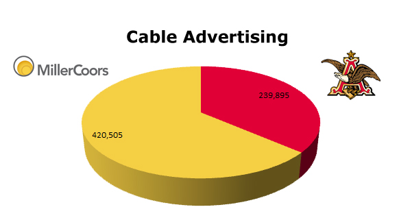 On Cable TV Local MillerCoors ran 420,505 spots in the last 12 months compared to Anheuser-Busch that ran 239,895 spots. The biggest months on cable for Anheuser-Busch were March with 28,865 and April with 28,857 spots. The biggest months for Miller spots were March with 47,958 spots and May with 47,344 units.