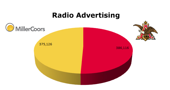 On Radio, the game was very even with MillerCoors running 375,126 spots against Anheuser-Busch spots totaling 386,116 ads. The biggest radio month for Miller spots was June with 54,483, while Anheuser-Busch ran hot in July with 48,650 spots.